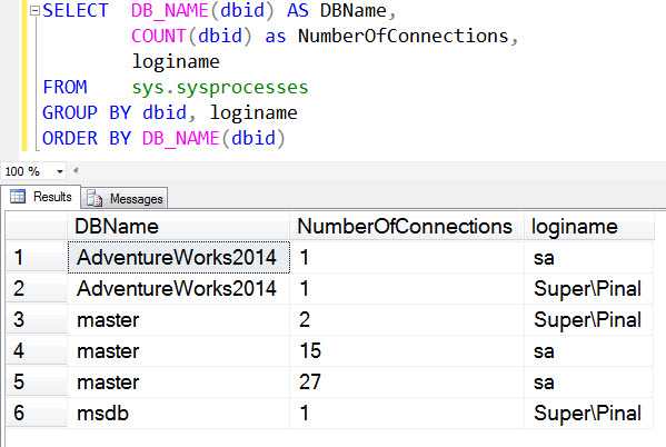 در SQL Server شما به سادگی می توایند اطلاعات تمامی کاربرانی که به Database ها متصل هستند را بدست آورید. برای بدست آوردن این اطلاعات کافی است که Query زیر را اجرا کنید.