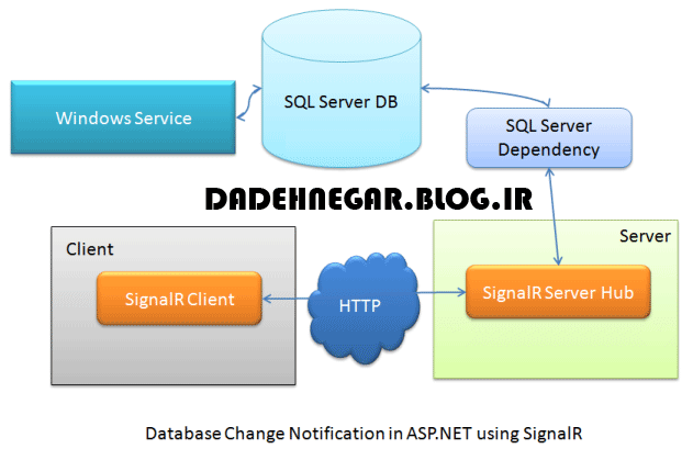 در این آموزش می خواهیم هر تغییری که در پایگاه داده Sql Server ( توسط change notification مشخص می شوند) ایجاد شده است را توسط SignalR در یک پروژه ASP.NET نمایش دهیم. این کار توسط یک query notification dependency مابین یک برنامه و یک نسخه از SQL Server انجام می شود، شیی که این وظیفه را انجام میدهد SqlDependency نام دارد.در نظر داشته باشید که پایگاه داده شما توسط windows service در background بروز رسانی وsynchronized (همزمان) با برنامه شما می شود و برنامه شما اطلاعات را به صورت real time نمایش می دهد.