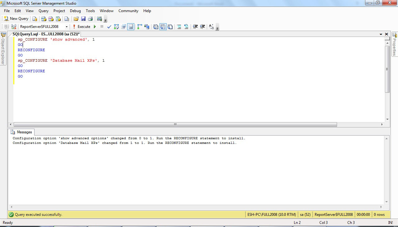 بعد از ساختن Database Mail و پیکر بندی آن نیاز داریم که Database Mail XPs را نیز از طریق پروسیجر sp_configure تنظیم نماییم برای این کار دستور زیر را باید اجرا کنیم