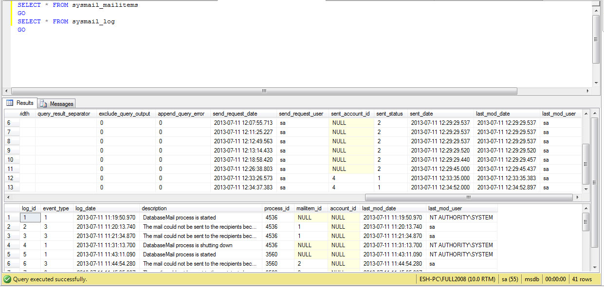 وضعیت ایمیل های ارسال شده در تیبل sysmail_mailitems نمایش داده می شود هنگامی که ایمیلی با موفقیت ارسال شود وضعیت فیلد sent_status در تیبل sysmail_mailitems برابر با یک می شود. وضعیت ایمیل های ارسال نشده یا همان failed شده ها در فیلد sent_status مقدارشان برابر 2 است و آنهایی هم که تنظیم نشده اند وضعیتشان برابر 3 قرار می گیرد