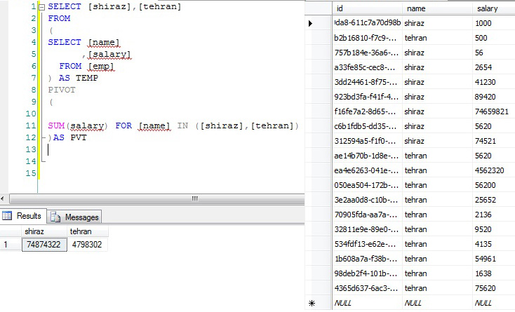 SUM(salary) FOR [name] IN ([shiraz],[tehran])