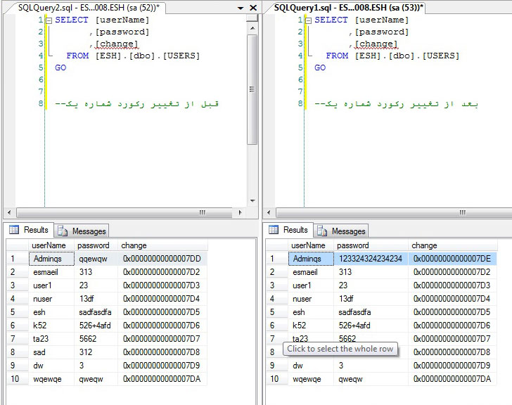 خوب راه دیگر استفاده از فیلد TimeStamp است که مقدار باینری را در خود نگه می دارد، در صورتی که مقدار رکورد عوض شود مقدار باینری این فیلد نیز عوض خواهد شد